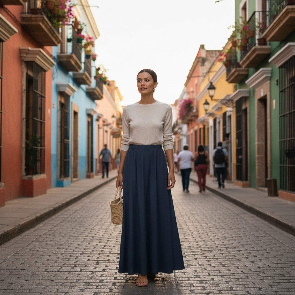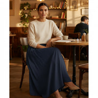 Jupe mi-longue élégante en viscose et lin, doublée, idéale pour l'automne.
