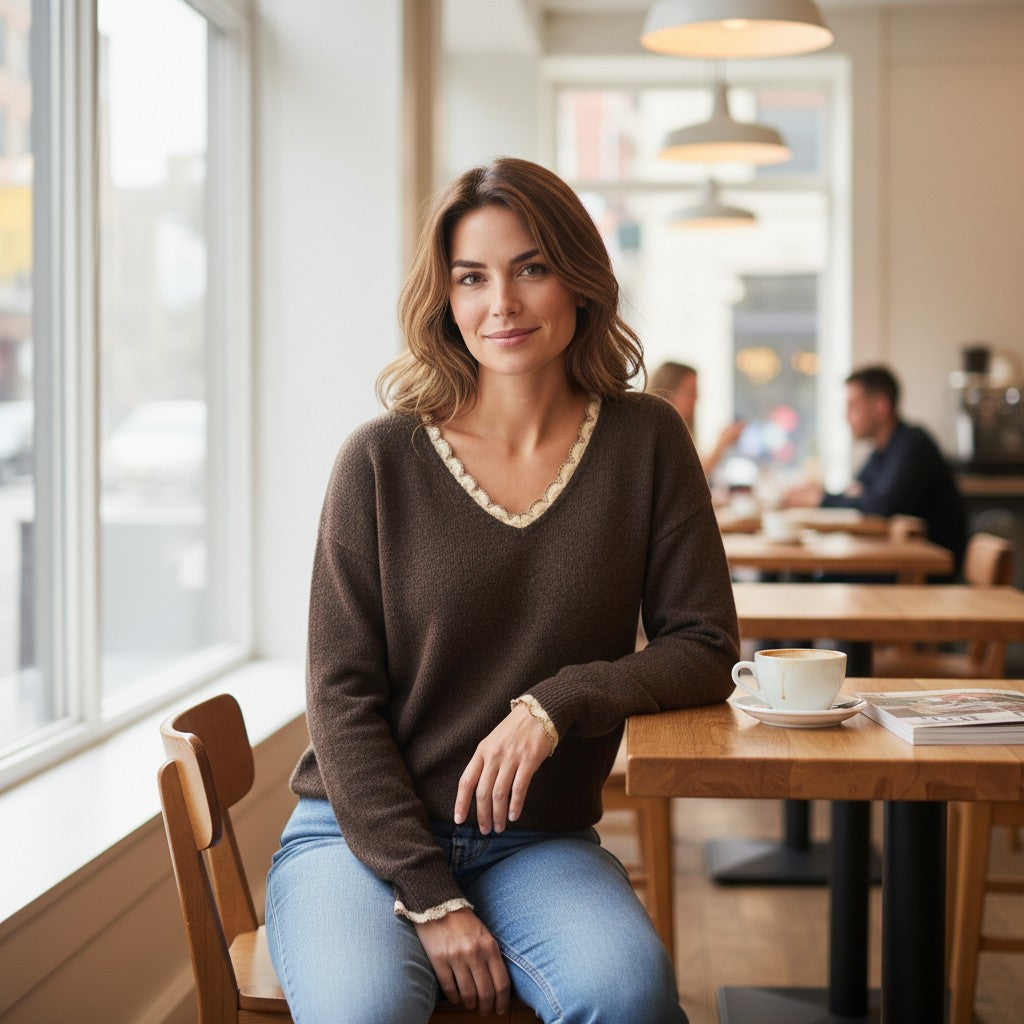 Style chic, parfait pour le quotidien ou les occasions habillées il allie confort, chaleur et élégance, avec des finitions crochet qui rendent ce pull vraiment unique.